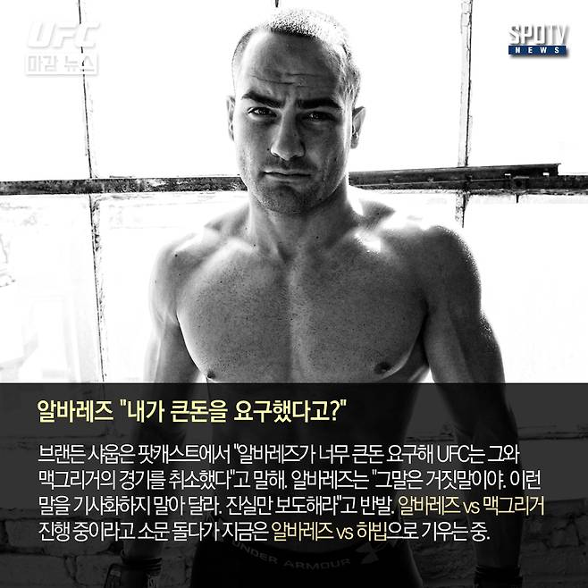 샤웁은 "알바레즈가 UFC에 맥그리거와 싸우려면 큰돈이 필요하다고 했다고 들었다. PPV 보너스도 올려 달라고 했단다. UFC는 알바레즈의 무리한 요구 때문에 맥그리거와 경기를 취소했다. 그래서 누르마고메도프와 붙이려고 한다"고 밝혔다.