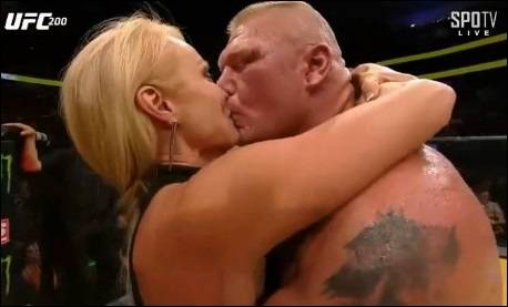 경기 후 브록은 아내 세이블과 키스하며 5년 만의 옥타곤 승리를 자축했다.