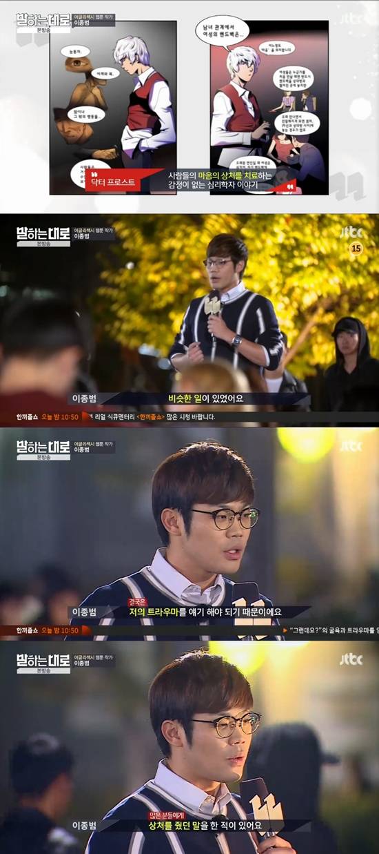 이날 이종범은 자신이 그리는 웹툰 '닥터 프로스트'를 소개했다. 그러면서 "마음의 상처를 지닌 분들을 많이 만나게 된다. 독자를 만나면 트라우마를 갖고 있냐고 물어보는데, 다들 트라우마가 없다고 한다. 하지만 트라우마는 거창한 게 아니다. 어떤 음식을 먹고 나서 탈이 나서 그 음식을 안 먹게 되는 것부터 취업 준비생이 명절을 싫어하는 것까지 트라우마다"라고 말문을 열었다.
