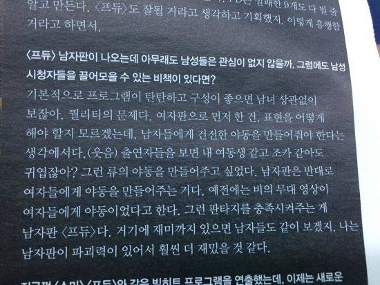 '기본적으로 프로그램이 탄탄하고 구성이 좋으면 남녀 상관 없이 보잖아. 퀄리티의 문제다. 여자판으로 먼저 한 건, 표현을 어떻게 해야 할지 모르겠는데. 남자들에게 건전한 야동을 만들어줘야 한다는 생각에서다.(웃음) 출연자들을 보면 내 여동생 같고 조카 같아도 귀엽잖아? 그런 류의 야동을 만들어주고 싶었다. 남자판은 반대로 여자들에게 야동을 만들어주는 거다. 예전에는 비의 무대 영상이 여자들에게 야동이었다고 한다. 그런 판타지를 충족시켜주는 게 남자판 프듀다. 거기에 재미까지 있으면 남자들도 같이 보겠지. 나는 남자판이 파괴력이 있어서 훨씬 더 재밌을 것 같다.'