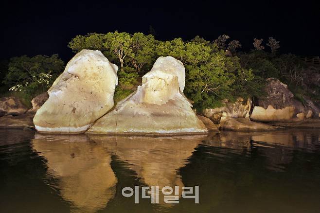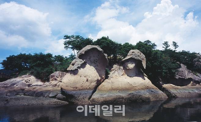 행상보행교 위에서 바라본 갓바위(천연기념물 제500호). 여기에는 아버비를 여읜 효자의 슬픈 설화가 전해지고 있다. 왼쪽 큰 바위가 아버지바위, 오른쪽 바위가 아들바위다.