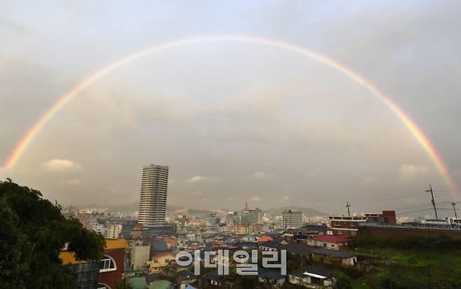 유달산 노적봉에서 바라본 목포시내 전경. 비온 뒤 목포 시내 위로 무지개가 떠 있다.