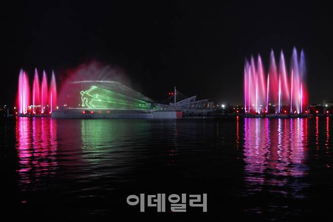 최근 명소로 떠오르고 있는 입압산 동쪽의 하당 신도심 바다 한 가운데 있는 춤추는바다분수.