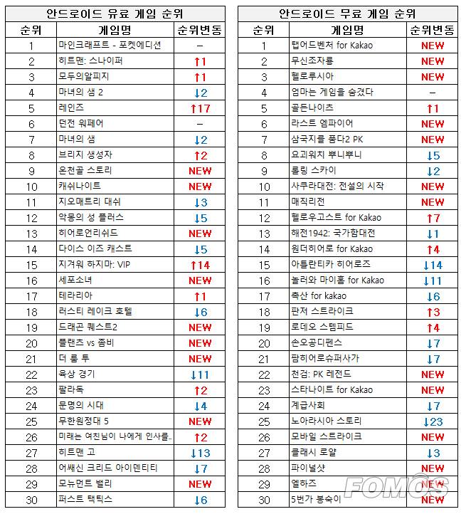 안드로이드 유료 게임 순위에서는 다소 정체됐던 지난 주와 달리 소소한 순위 변동이 이어졌다. 1위는 여전히 '마인크래프트 - 포켓에디션'이 차지했으며 스퀘어에닉스의 '히트맨 스나이퍼'가 한 단계 상승한 2위를 차지했다.