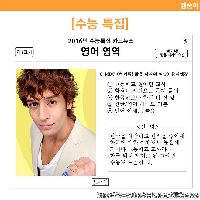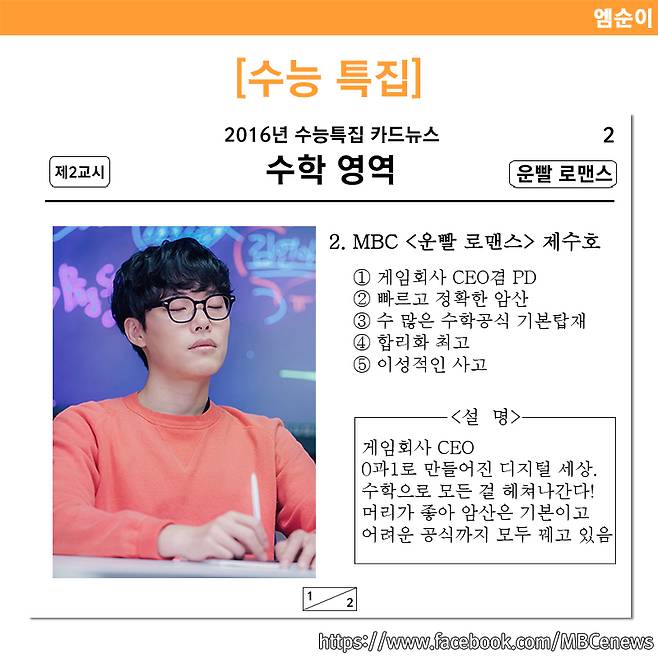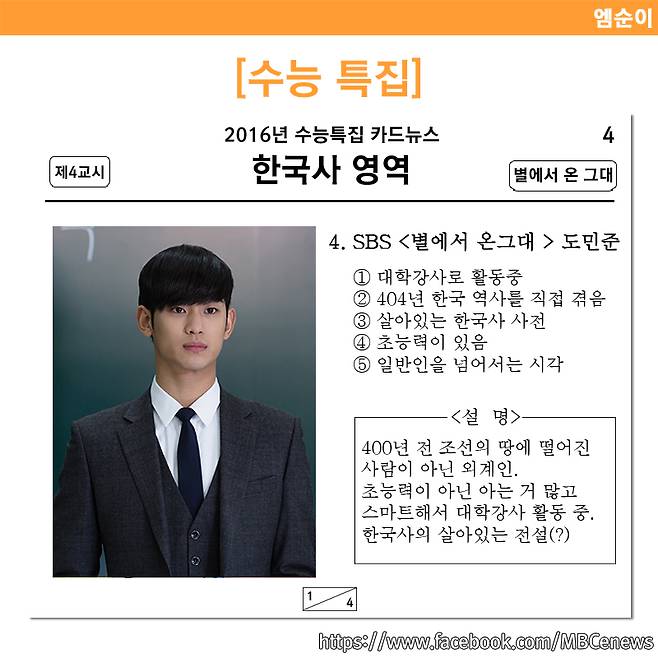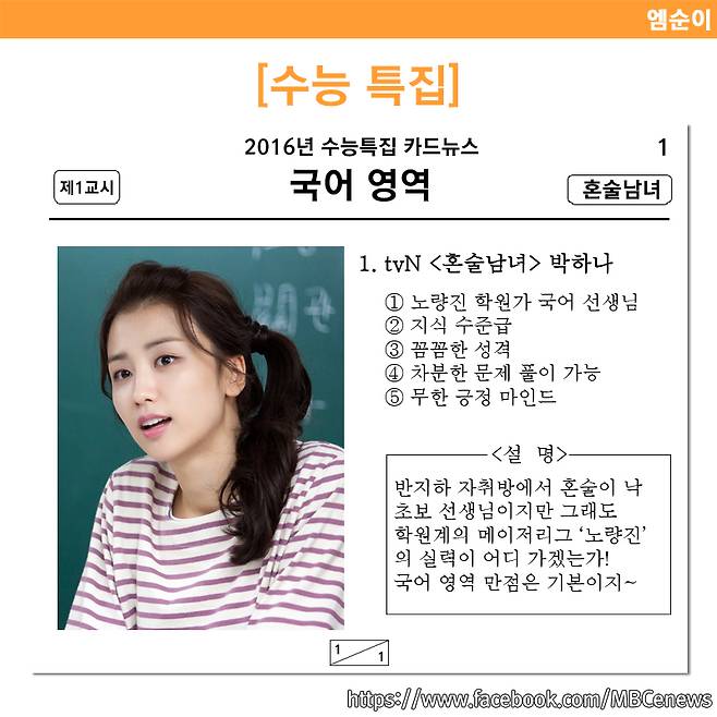 대학수학능력시험(수능)이 코 앞으로 다가왔다. 그동안의 노력의 결실을 맺는 중요한 날인만큼 수험생들 모두 긴장하지 않고 최선을 다해 좋은 성적을 거둘 수 있기를 바란다. 기억이 나지 않는다거나 어려운 문제 때문에 당황했을 때 간혹 그런 생각을 하기도 했을 것이다. "아 내가 ○○○이었다면... 이 문제를 풀 수도 있었을 텐데" 라고, 그 마음을 담아 준비한 드라마 속 캐릭터들의 수능 능력표. 이들이 각 시간에 빙의한다면 수능은 따놓은 당상이겠지만, 헛된 꿈이라고 생각되니 가볍게 즐겨보자.