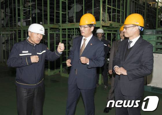 조경규 환경부 장관이 9일 오후 폐가전제품을 재활용하고 있는 경기도 용인시 수도권자원순환센터에서 재활용업계 관계자와 이야기를 나누고 있다. (환경부 제공) 2016.11.9/뉴스1
