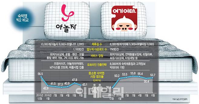 닐슨코리안클릭에 따르면 중소형 호텔(모델)앱 올해 6월 순이용자 수 점유율은 여기어때가 53.7%, 야놀자가 43.1%, 여기야가 3.2%였다.