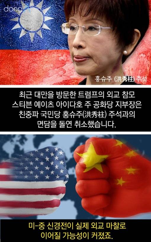 최근 대만을 방문한 트럼프의 외교 참모 스티븐 예이츠 아이다호 주 공화당 지부장은 친중파 국민당 훙슈주(洪秀柱) 주석과의 면담을 돌연 취소했습니다. 미-중 신경전이 실제 외교 마찰로 이어질 가능성이 커졌죠.