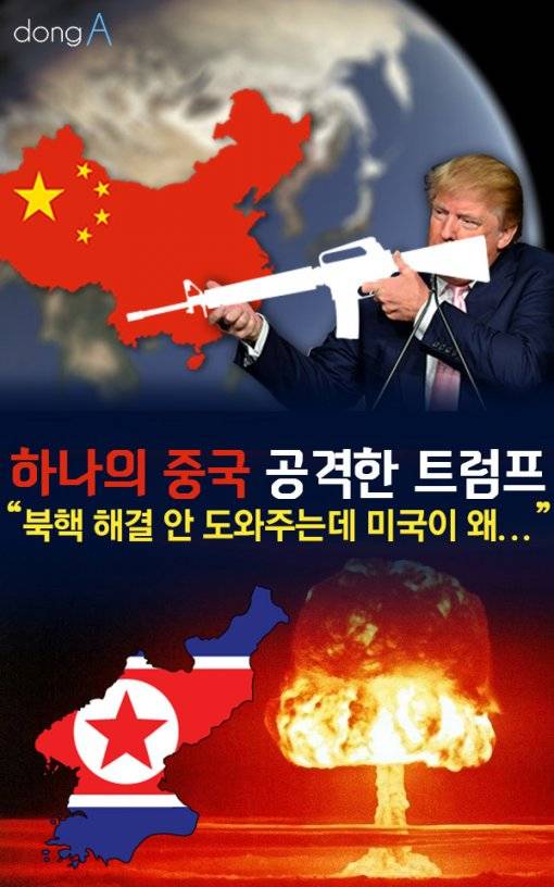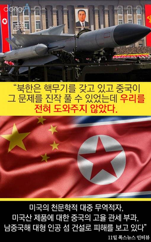 "북한은 핵무기를 갖고 있고 중국이 그 문제를 진작 풀 수 있었는데 우리를 전혀 도와주지 않았다. 미국의 천문학적 대중 무역적자, 미국산 제품에 대한 중국의 고율 관세 부과, 남중국해 대형 인공 섬 건설로 피해를 보고 있다" 11일 폭스뉴스 인터뷰