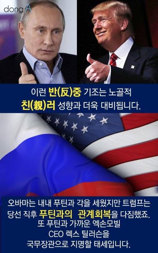 이런 반(反)중 기조는 노골적 친(親)러 성향과 더욱 대비됩니다. 오바마는 내내 푸틴과 각을 세웠지만 트럼프는 당선 직후 푸틴과의 관계회복을 다짐했죠. 또 푸틴과 가까운 엑손모빌 CEO 렉스 틸러슨을 국무장관으로 지명할 태세입니다. #11.