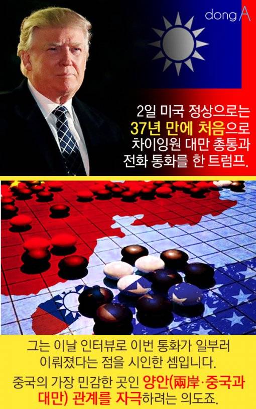 2일 미국 정상으로는 37년 만에 처음으로 차이잉원 대만 총통과 전화 통화를 한 트럼프. 그는 이날 인터뷰로 이번 통화가 일부러 이뤄졌다는 점을 시인한 셈입니다. 중국의 가장 민감한 곳인 양안(兩岸¤¤중국과 대만) 관계를 자극하려는 의도죠.