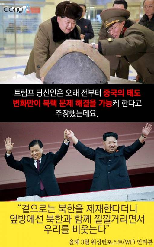 트럼프 당선인은 오래 전부터 중국의 태도 변화만이 북핵 문제 해결을 가능케 한다고 주장했는데요. "겉으로는 북한을 제재한다더니 옆방에선 북한과 함께 낄낄거리면서 우리를 비웃는다"