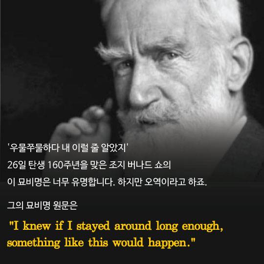묘비명은 한 사람의 인생을 압축해 설명합니다. 또 어떻게 기억되고 싶은지 바람이 담기기도 합니다. 우리는 누구의 어떤 묘비명을 기억하고 있을까요. '우물쭈물하다 내 이럴 줄 알았지' 21일 탄생 160주년을 맞은 조지 버나드 쇼의 이 묘비명은 너무 유명합니다. 하지만 오역이라고 하죠. 그의 묘비명 원문은 "I knew if I stayed around long enough, something like this would happen."