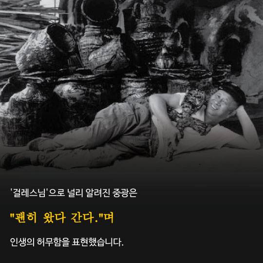 '걸레스님'으로 널리 알려진 중광은 "괜히 왔다 간다"며 인생의 허무함을 표현했습니다. 천상병 시인의 묘비에는 그의 시 '귀천'이 새겨져있습니다. "나 하늘로 돌아가리라 아름다운 이 세상 소풍 끝내는 날 가서 아름다웠더라고 말하리라"