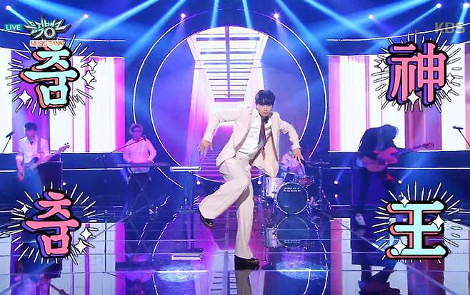 '정진운밴드'라는 록밴드로 지난달 복귀한 그는 지상파 음악 방송에서도 전혀 어울리지 않는 이 춤을 췄다. 방송사는 '춤神춤王'이라는 자막을 대문짝만 하게 달았다〈사진〉. 지난주 음악 방송에 데뷔한 C.I.V.A 역시 그에게 배운 춤으로 무대를 마무리했다. 정진운은 인스타그램에 "많이 늘었다"며 이들의 사진을 올렸다.
