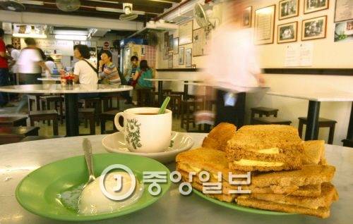 쿠알라룸푸르는 덥다. 더운데다 습하다. 조금만 거리를 쏘다녀도 진이 빠지고 급속도로 당이 떨어진다. 하여 달달한 음료나 첸돌 같은 디저트를 많이 먹는다. 심지어 이른 아침에도 달달한 음식을 먹는다. 대표적인 음식이 카야 토스트(Kaya Toast)다. 이름 그대로다. 카야라는 잼을 곁들인 토스트다. 중독적인 맛의 비결은 카야 잼에 있다. 코코넛 밀크, 설탕, 판단 잎을 주재료로 하는 카야 잼은 정신이 번쩍 들 만큼 맛이 달면서도 풍미가 깊다. 카야 잼과 함께 두툼하게 버터를 발라서 먹는다. 연유를 탄 진한 커피가 찰떡 궁합니다. 말레이시아 사람들은 카야 토스트에 수란을 곁들여 아침식사로 먹기도 한다. 올드 타운 화이트 커피(Old Town White Coffee)라는 체인점이 쿠알라룸푸르 곳곳에 있다. 유난히 더웠던 오후, 센트럴마켓을 구경하다가 올드 타운 화이트 커피에서 먹은 토스트와 커피 맛을 잊을 수가 없다. 올드타운 화이트커피 카야 토스트 약 1400원.