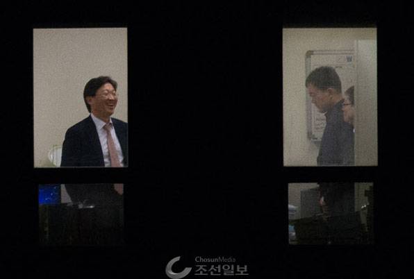 잠시 뒤엔 피의자의 변호사가 사무실 중앙에서 호탕하게 웃는 모습이 찍혔다. 이때에도 검찰 직원들은 반듯하게 서서 예우를 다 하고 있다.
