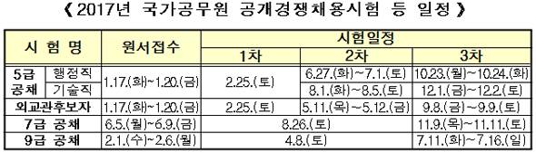 인사혁신처는 이 같은 내용의 ‘2017년도 국가공무원 공개경쟁채용시험 등 일정’을 3일 공고한다고 2일 밝혔다.