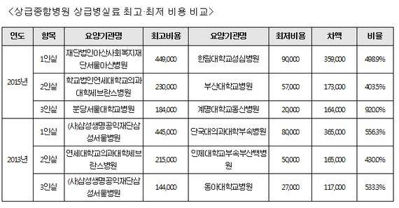 윤 의원에 따르면 지난해 기준 1인실 입원비가 가장 비싼 병원은 서울아산병원으로 44만9000원이었다. 반면 한림대성심병원은 9만원으로 가장 낮았다. 2013년 당시 삼성서울병원이 44만5000원으로 최고, 단국대병원이 8만원으로 최저였던 것과 비교하면 큰 차이가 없는 셈이다. 2인실 입원비도 상황은 비슷했다. 지난해 기준으로 세브란스병원(23만원)이 부산대병원(5만7000원)의 4배를 넘었다. 2013년에도 세브란스병원(21만5000원)이 부산백병원(5만원)의 4배 이상이었다. 2년새 최저·최고 비용 모두 오른 동시에 병원별 격차가 그대로 유지된 것이다.