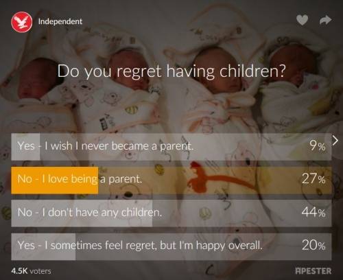 | ‘아이 낳은 걸 후회하시나요?’라는 주제로 실시된 영국 인디펜던트 여론조사. 4496명의 9%가 ‘부모가 된 걸 후회한다’고 답했다. 인디펜던트 캡처 |