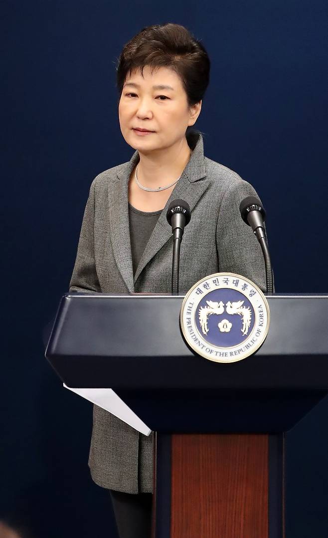 | ▲ 박근혜 대통령이 29일 오후 청와대 춘추관 대브리핑실에서 제3차 대국민담화를 발표한 뒤 한 기자의 질문을 듣고 있다. |