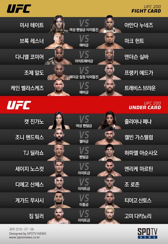 UFC 200 메인 카드 5경기는 10일 오전 11시부터 SPOTV가 생중계한다.