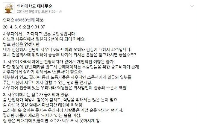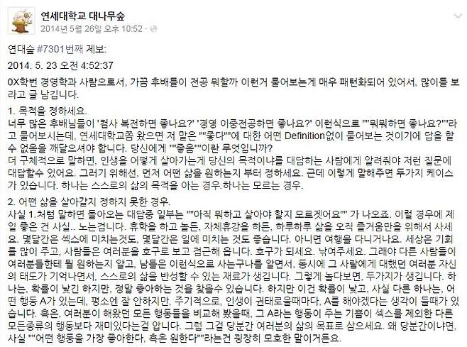 A : (김모, 이하 '김') "연대숲을 보면 연세대 학생들이 말하는 솔직한 연세대에 대해 알 수 있어서 보고 있어."