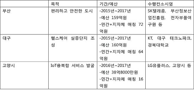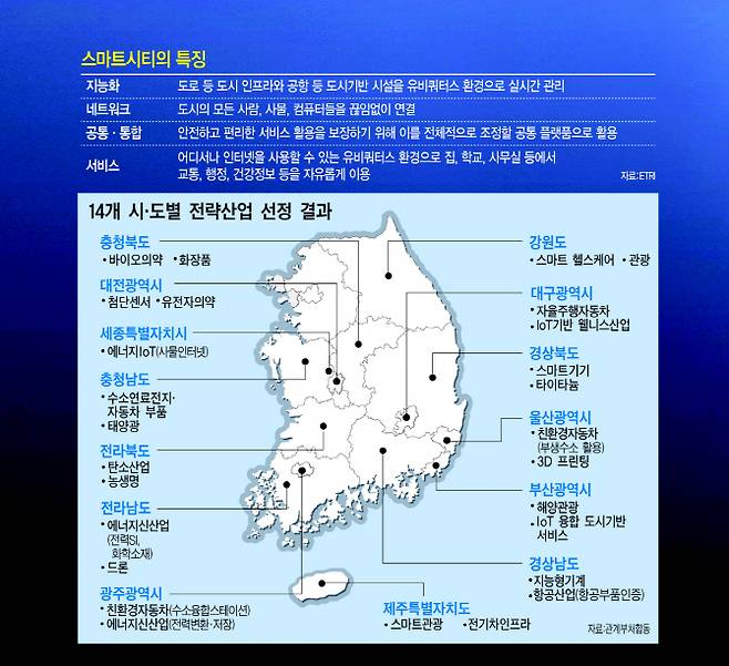 한국에서 스마트시티는 △시민의 삶 향상을 위한 맞춤형 스마트시티 구축과 △세계 선도형 스마트시티 기술 확보를 통한 해외시장 진출이라는 두 가지 큰 방향으로 진행되고 있다. 지자체 가운데는 서울, 부산, 인천, 세종, 제주, 대구, 고양시 등 약 50여개 지자체가 추진하고 있다. 대표적으로는 송도와 청라 국제도시에 스마트시티를 구축 중인 인천, 미래창조과학부의 IoT(사물인터넷) 실증단지로 지정된 부산과 대구와 고양시,두바이 국영기업인 스마트시티 두바이(SCD)와 제휴한 인천검단 등이 꼽히고 있다.
