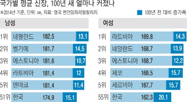2014년 만 18세를 기준으로 네덜란드 남성의 평균 키는 182.5㎝로 100년 전보다 13.1㎝ 컸다. 라트비아 여성의 평균신장은 같은 기간 14.3㎝가 늘어나 169.8㎝를 기록했다. 평균 키가 가장 많이 커진 것은 한국 여성이다. 100년 전 142.2㎝로 200개국 중 다섯 번째로 키가 작았던 한국 여성은 162.3㎝로 20.1㎝나 커졌다. 한국 남성의 평균신장도 큰 폭으로 올랐다. 이란 남성의 오름폭(16.5㎝)에는 조금 못 미쳤지만 15.1㎝나 성장해 평균신장이 174.9㎝에 달했다.
