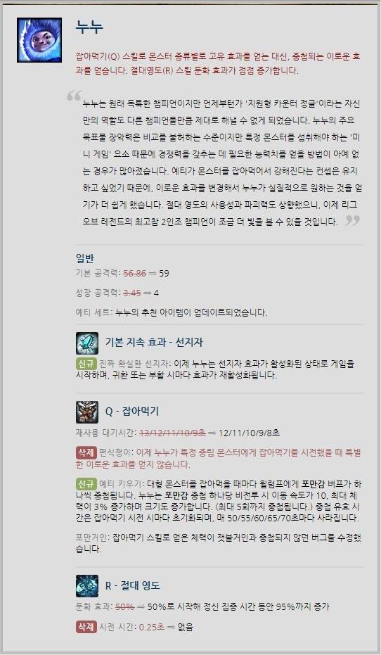 프렐요드 지역 두 챔피언의 희비가 엇갈렸다. 주로 정글 챔피언으로 활용되는 누누의 변경 사항은 대체적으로 상향이라는 평가다. 우선 누누의 기본 능력치가 좋아졌다. 기본 공격력이 56.86->59로 높아졌으며 성장 공격력 또한 3.45->5로 상향됐다. 누누만의 추천 아이템이 업데이트됐고, 기본 지속 효과인 선지자가 게임 시작과 귀환, 부활 시마다 재활성화되도록 변경됐다.