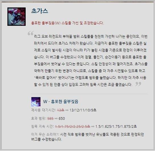 이제는 희귀해진 침묵 효과를 보유하고 있는 초가스지만 전장에 등장한지는 오랜 시간이 지났다. 라이엇 게임즈는 초가스의 W스킬 흉포한 울부짖음을 상향해 초가스의 재기를 돕고 나섰다.