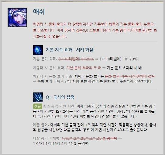 Q스킬 궁사의 집중의 피해량도 줄었다. 다발 공격의 피해량이 스킬 레벨 당 1.15/1.2/1.25/1.3/1.35 총 공격력->1.04/1.1/1.15/1.2/1.25 총 공격력으로 감소했다. 패치 이후 애쉬가 궁사의 집중 스킬을 시전하면 기본 공격이 완전히 초기화되는 대신 기본 공격 지연 시간이 정상값의 40%로 줄어든다.