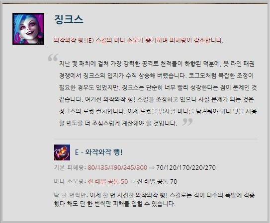 기본 지속 능력과 사거리, 아이템 루난의 허리케인과의 시너지 효과로 최근 각광받고 있는 원거리 딜러 챔피언 징크스가 하향된다. E스킬 와작와작 뻥!의 기본 피해량이 스킬 레벨 당 80/135/190/245/300->70/120/170/220/270으로 낮아졌다. 또한 마나 소모량이 전 레벨 공통 50->70으로 증가해 좀 더 신중한 사용을 요한다.