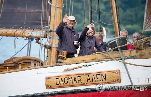 epa05451799 Adventurer Arved Fuchs and his wife Brigitte Ellerbrock return to port on the ship 'Dagmar Aaen,' ending the year-long, 40,000-km 'Ocean Change' expedition in Hamburg, Germany, 02 August 2016. EPA/DANIEL REINHARDT