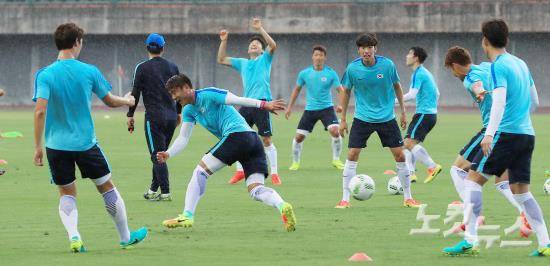 축구 올림픽대표팀이 1일 오전(현지시간) 브라질 사우바도르 피투아쿠 경기장에서 비를 맞으며 훈련을 하고 있다.