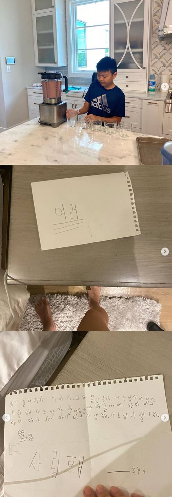 공개한 사진 속에는 건우의 서툰 한국어 손편지가 담겨 있다. 엄마를 향한 사랑의 메시지가 미소를 자아낸다.