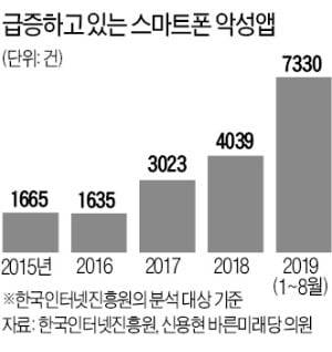 스마트폰을 노린 해킹 공격은 꾸준히 증가하고 있다. 한국인터넷진흥원(KISA)에 보고돼 분석 절차에 들어간 악성 앱 수는 △2015년 1665건 △2016년 1635건 △2017년 3023건 △2018년 4039건으로 집계됐다. 지난해 1~8월에는 7330건이 적발돼 연간 1만 건을 넘길 전망이다. 안랩에 따르면 지난해 이 회사가 분석한 모바일용 악성코드 샘플 수는 약 236만 건에 달한다.