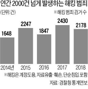 경찰통계연보에 따르면 정보통신망 침해 범죄 중 해킹 발생 건수는 △2014년 1648건 △2015년 2247건 △2016년 1847건 △2017년 2430건 △2018년 2178건으로 집계됐다. 최근 들어 해마다 2000건 이상이 발생하고 있다.