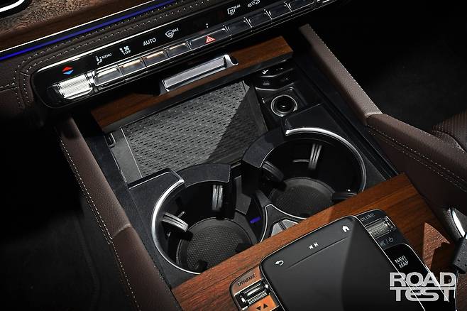 어차피 사용 빈도가 많아 항상 열어놓는다고 생각한 걸까? 무선충전 패드와 컵홀더 2개를 덮은 뚜껑은 수동식 슬라이딩 방식이다. 또한, USB-C타입 포트와 요즘 차에선 보기 힘든 시거 잭이 있다. 따라서 일반 USB를 쓰는 제품을 이용할 경우 C타입 젠더가 있어야 한다.
