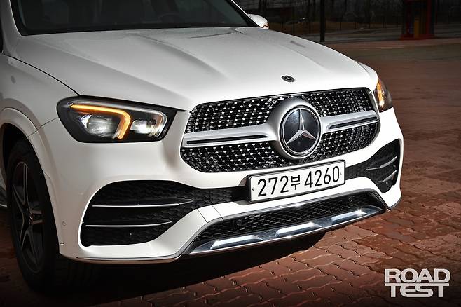 GLE 450 앞모습에서 가장 먼저 눈에 띄는 곳은 라디에이터 그릴이다. 다른 벤츠 SUV 형제들처럼 8각형 SUV 전용 그릴을 쓴다. 300d는 가로줄이 두 개인 반면, 450은 한 줄만 써 보다 간결한 느낌이다.