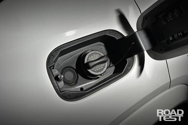 뒷모습을 보면 얇게 빚은 리어램프가 눈에 들어온다. 범퍼 양쪽을 이미테이션 에어커튼으로 채우고 아래쪽은 앞 범퍼처럼 크롬으로 장식했다. 양쪽 배기구는 구멍 뚫린 척 하는 가짜다. 진짜 배기구는 왼쪽에만수도꼭지 모양으로 자리했다. 디젤 모델은 오른쪽에 요소수 탱크가 들어가기 때문이다. 주유구는 여백이 많다. 요소수 주입구를 다는 디젤 모델과 공유하기 위해서다.