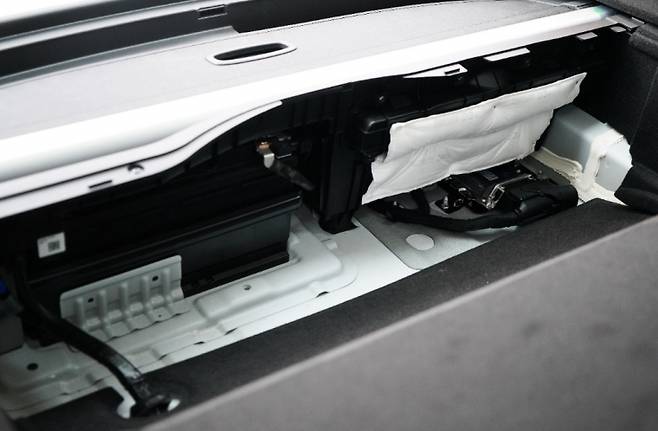 최근 GV80이 정조준한 경쟁 상대인 BMW X5, 메르세데스 벤츠 GLE 실내를 여유롭게 살펴볼 기회가 있었다. 시각적인 화려함이나 소재의 고급감은 GV80이 우위를 점하기도 했지만, 두 차종에 비해 턱없이 부족해 보이는 부분이 있었다. 바로 트렁크 하부 마감 처리다. GV80의 트렁크는 아웃도어 패키지 적용 여부 기준 러기지 매트, 러기지로 구성되어 있다. 이를 하나씩 걷어내면 정말 생각지도 못한 속살과 마주하게 된다. 노출된 차체에는 흡음재와 접착제, 각종 배선 등이 위치해 있다.