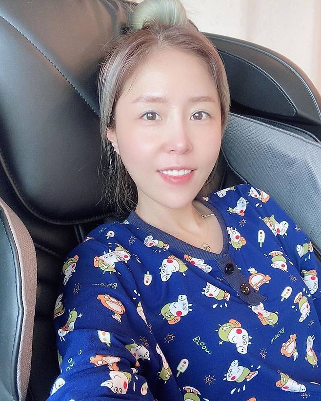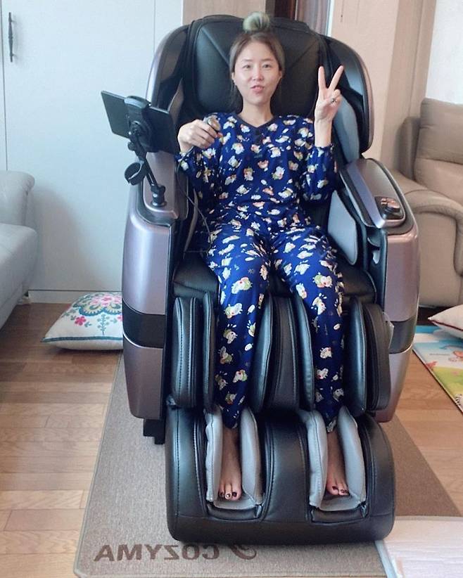 사진 속 신지는 안마 의자에 앉아 브이를 하고 있다.
