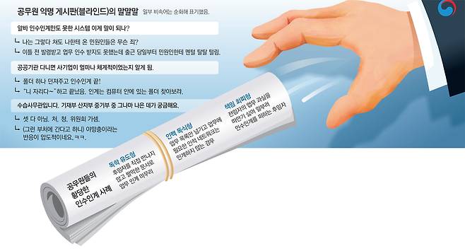 한국 공직사회는 인사이동이나 조직개편이 상당히 잦다. 하지만 이에 따른 업무 인수인계는 주먹구구로 이뤄진다는 지적이 많다. 젊은 공무원들이 공직의 일상에 좌절하는 이유 중 하나가 부실과 무성의로 화석화된 인수인계 시스템이다. 사소한 것처럼 보이지만 사소하지 않다. 부실한 인수인계는 일반 행정과 정책의 공백으로 이어진다. 민원인의 돈 낭비, 시간 낭비를 초래한다. 고쳐지지 않는 이유는 구조화된 관행과 함께 메뚜기처럼 보직을 옮겨 다녀야 승진이 유리한 인사 시스템 때문이다.