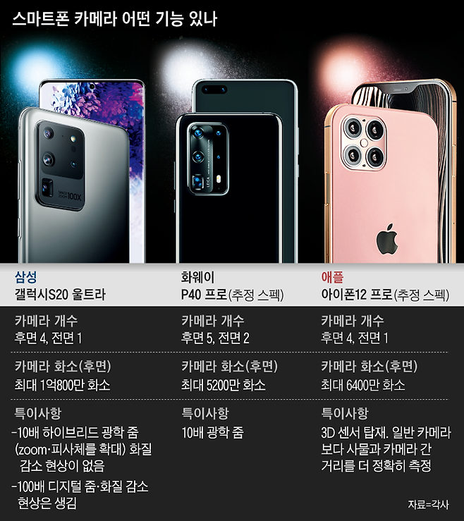 경쟁을 잘 보여주는 것은 스마트폰 후면의 카메라 렌즈 개수다. 화웨이는 이달 26일 프랑스 파리에서 공개하는 신제품 'P40' 시리즈에서 5개(펜타)의 카메라를 탑재한 신제품을 내놓을 전망이다. 최상위 모델인 P40프로를 세계 첫 '펜타 카메라폰'으로 만들겠다는 것이다. 전작인 P30프로는 카메라 개수가 4개였다. 삼성전자의 최신 스마트폰 갤럭시S20 울트라(카메라렌즈 4개·쿼드)보다 하나 더 많다. 애플도 올 9월 공개 예정인 '아이폰12프로'의 카메라 개수를 전작보다 하나 늘릴 것으로 예상된다.
