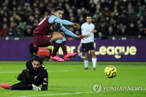 epa08176861 Manuel Lanzini (R) of West Ham and goalkeeper Alisson Becker of Liverpool in action during the English Premier League soccer match between West Ham United and Liverpool FC held at the London Stadium in London, Britain, 29 January 2020. EPA/HOLLY ALLISON EDITORIAL USE ONLY. No use with unauthorized audio, video, data, fixture lists, club/league logos or 'live' services. Online in-match use limited to 120 images, no video emulation. No use in betting, games or single club/league/player publications