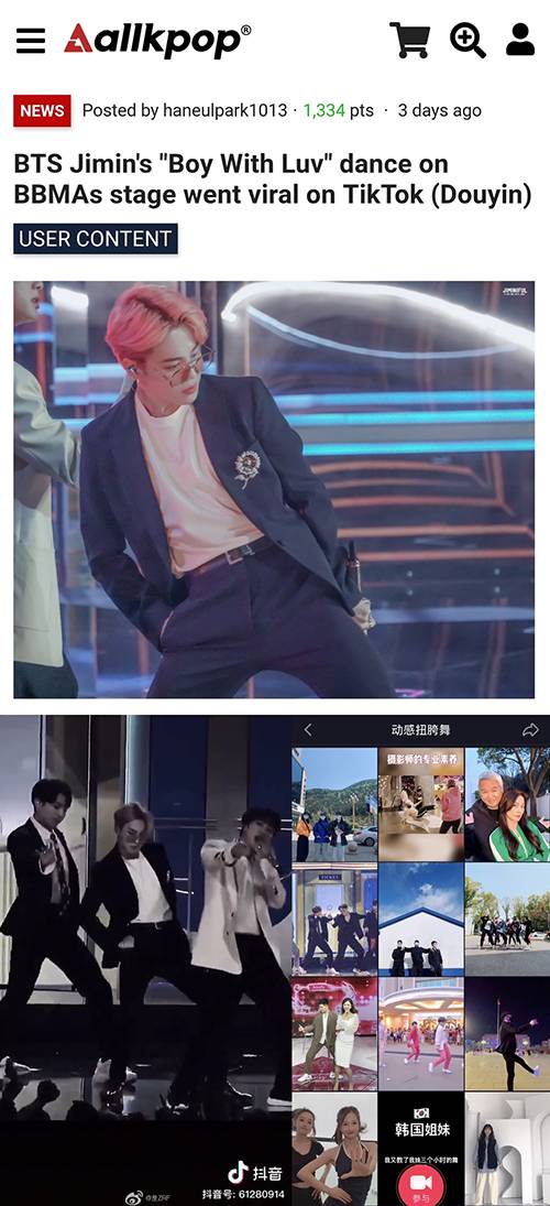 최근 중국판 틱톡(TikTok)인 글로벌 동영상 플랫폼 도우인(Douyin)에서는 방탄소년단 지민이 2019 빌보드 뮤직 어워드 '작은 것들을 위한 시(Boy With Luv, 이하 작은 시)' 무대에서 선보였던 댄스 동작 따라 하기 열풍이 거세다.