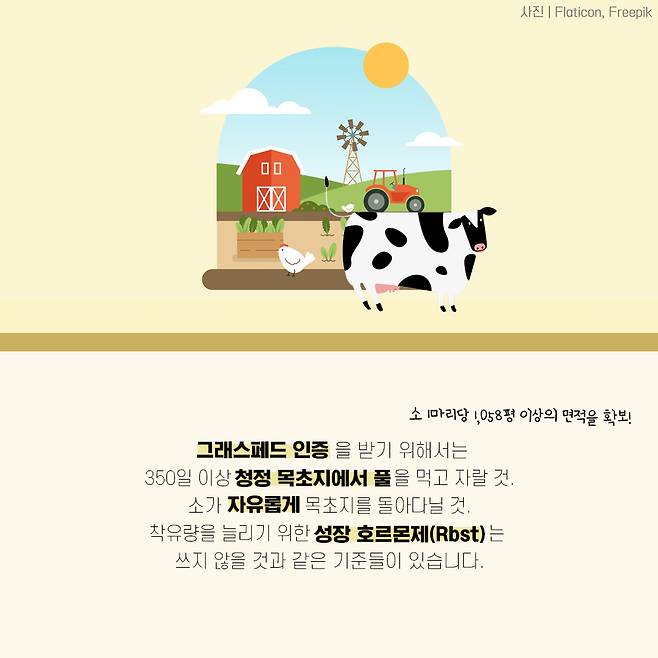 그래스페드인증을 받기 위해서는 350일 이상 청정 목초지에서 풀을 먹고 자랄 것. 소가 자유롭게 목초지를 돌아다닐 것. 착유량을 늘리기 위한 성장 호르몬제(Rbst)는 쓰지 않을 것과 같은 기준들이 있습니다. (소 1마리당 1058평 이상의 면적을 확보)