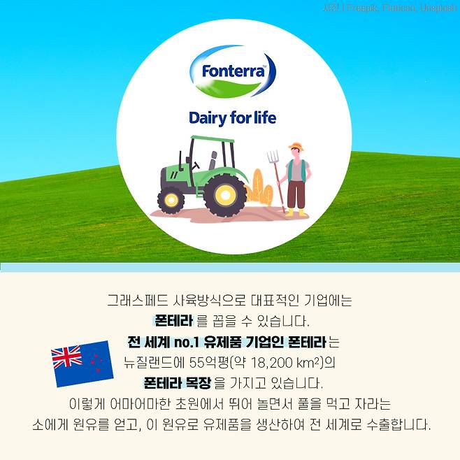 그래스페드 사육방식으로 대표적인 기업에는 폰테라를 꼽을 수 있습니다. 전 세계 no.1 유제품 기업인 폰테라는 뉴질랜드에 55억평(약 18,200km)의 폰테라 목장을 가지고 있습니다. 이렇게 어마어마한 초원에서 뛰어 놀면서 풀을 먹고 자라는 소에게 원유를 얻고, 이 원유로 유제품을 생산하여 전 세계로 수출합니다.