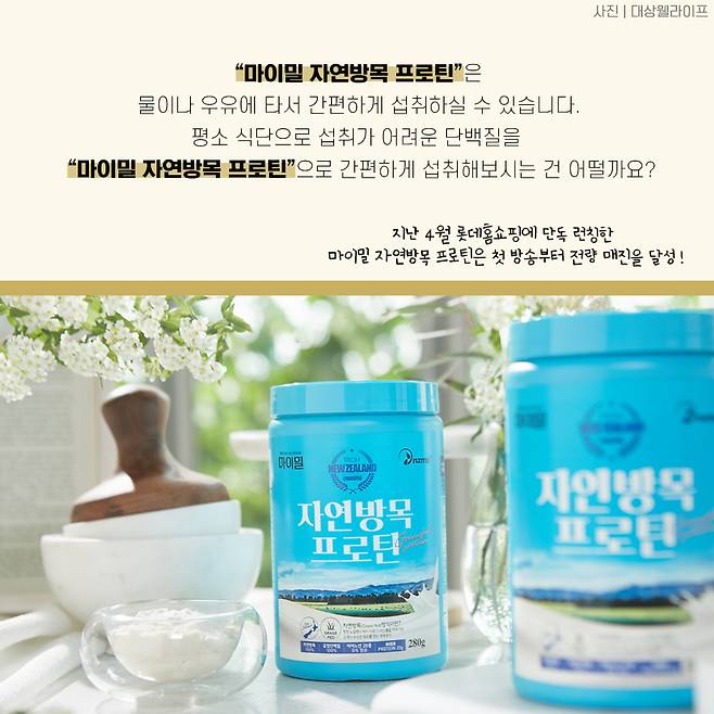 "마이밀 자연방목 프로틴"은 물이나 우유에 타서 간편하게 섭취하실 수 있습니다. 평소 식단으로 섭취가 어려운 단백질을 "마이밀 자연방목 프로틴"으로 간편하게 섭취해보시는 건 어떨까요? 지난 4월 롯데홈쇼핑에 단독 런칭한 마이밀 자연방목 프로틴은 첫 방송부터 전량 매진을 달성!